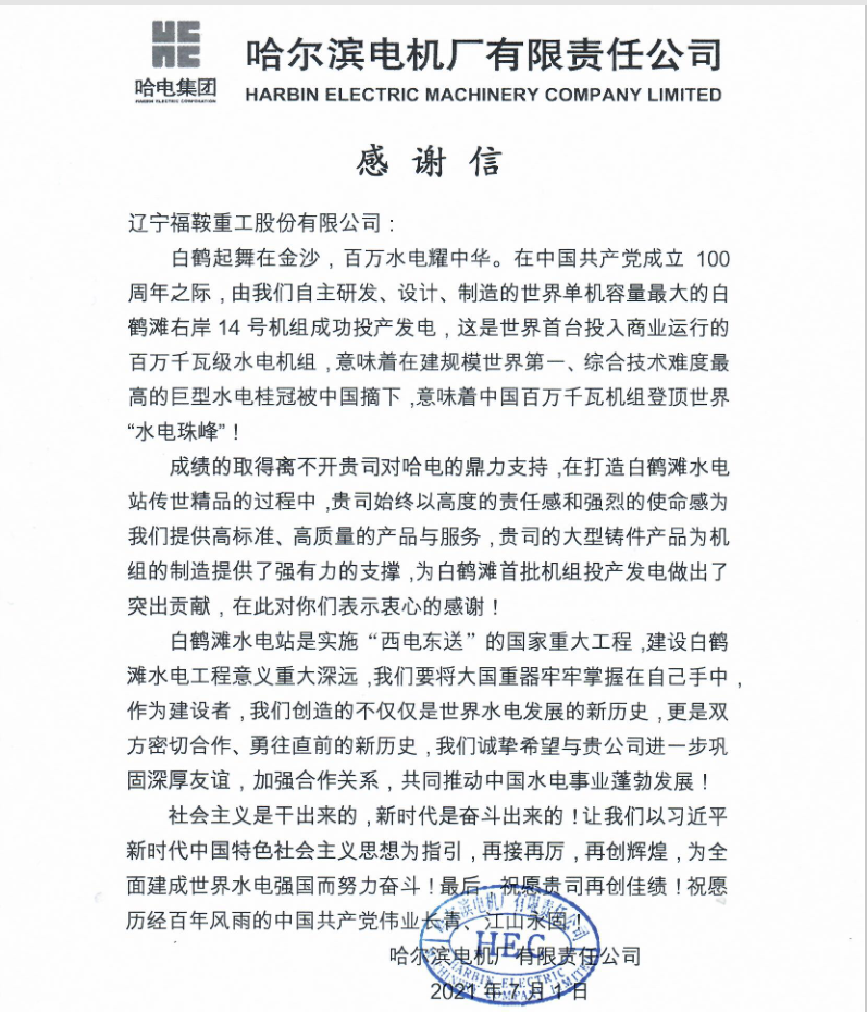 福鞍股份為白鶴灘 水電站機(jī)組提供鑄造核心零部件——哈電集團(tuán)給福鞍發(fā)來感謝信